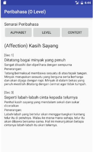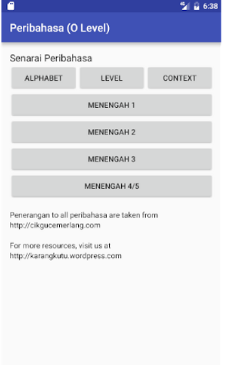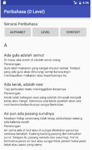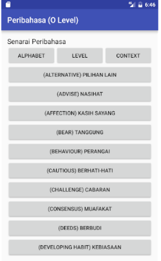 This app contains the list of Malay proverbs for O-level. Each proverb is given an explanation and the proverbs are arranged according to alphabet, level, and context of use.