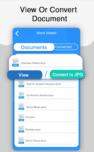 Word viewer and reader easily converts doc files to jpeg, application magically finds all the document files from your device, makes a list and presents to you within seconds,