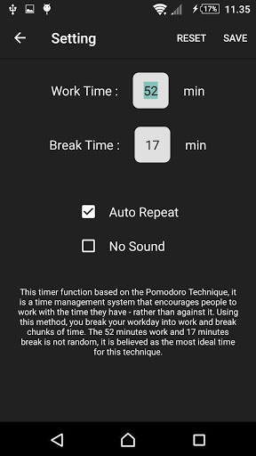 This timer function based on the Pomodoro Technique, it is a time management system that encourages people to work with the time they have - rather than against it. Using this method, you break your workday into work and break chunks of time. The 52 minutes work and 17 minutes break is not random, it is believed as the most ideal time for this technique.