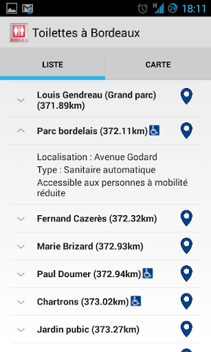 L'application affiche l'emplacement des toilettes, leur nature ainsi que l'accessibilité aux personnes à mobilité réduite.
