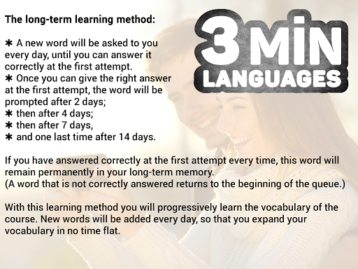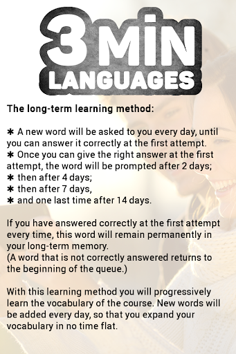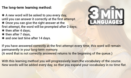 With this method you will learn new vocabulary in no time flat. Already learned vocabulary will be repeated using a specific timed pattern: