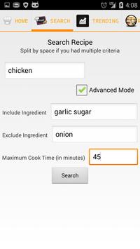 Advanced Mode: search by keywords, include ingredient, exclude ingredient, maximum cook time