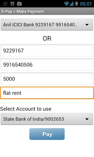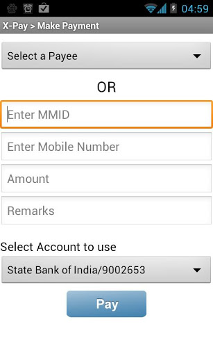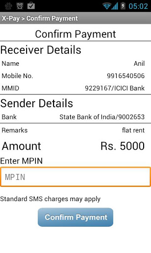XPay is a Multi Bank IMPS Mobile Payment application. This application facilitates mobile payment to anyone with IMPS enabled bank account across india IMPS Interbank Mobile Payment Service allows customers to make instant, 24x7, interbank payments to individuals, or merchants enterprises via mobile phone.Read more about IMPS here http:www.npci.org.inaboutimps.aspxHow to get your bank account MMID ?http:www.xpay.ingetmmidSupported Banks for Sending Money:Andhra BankBank of BarodaBank of IndiaCentral bankCitiBankFederal BankIndian BankIndusind BankKarur Vysya BankOriental Bank of CommercePunjab National BankState Bank of IndiaUCO BankUnion BankVijaya BankSupported Banks for Receiving Money:All 45 private and Public BanksDisclaimer:Features supported by banks39; SMS banking facility are only available. All user account information are stored in the device and data communication happends driectly from the mobile to the bank via SMS. Xpay is not endorsed by any bank or NPCI. In no event shall the provider of this application be liable for any direct, indirect, punitive,incidental,special or consequential damages arising out of or in any way connected with the use of the application.