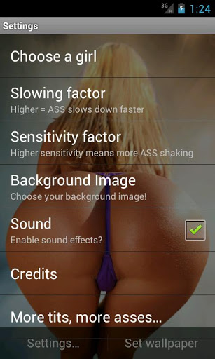 Shake it, touch it, bounce it like crazy No. 1 interactive ass simulatorThis is our free version of the famous ASS Sexy butt simulator Try it out You can also add new girls by selecting them in the settings menu and activate them through google Play store. As soon as you shake your mobile the lady39;s cheeks will start bouncing, wobbling and shaking on your phone desktop. You can also touch the cheeks, move them or even give them a little clap on the buttocksThe free version includes one sexy bouncing, shaking wobbling butt Completely for free, no hidden costs Have a look at our video and see for yourself Note: the video shows the paid app quot;ASS Interactive butt simulator quot;which includes more girls and more backgrounds, but other than that it39;s the sameTry to find our hidden sound effects by playing with the butts in different ways hint: try multitouch Fun for the whole family .. well almost :Like in our other apps e.g.: bOObs interactive tits you can adjust all bouncing and shaking effects in the settings menu: You can comfortably tune the effects to create your ultimate ASS bouncing experience, matched to your handset and shaking style.In the settings menu just click on: Slowingfactor: A higher slowing factor will slow the jiggling of the ASS faster. Sensitivityfactor: The higher the sensitivity, the less you have to move your handset for total jigglyness. Choose from many different background images such as NOT AVAILABLE IN FREE VERSION: US Flag, Leather, Racing, Laser, Tech, Island, Red Grunge, Waterdrops... to match your taste. Supports all screen sizes from small to XL and also works on tablets even in landscape mode.100 AdFree100 Spam and Virus Free100 no hidden costs100 pure fun100 ass, butts, booty shaking madness