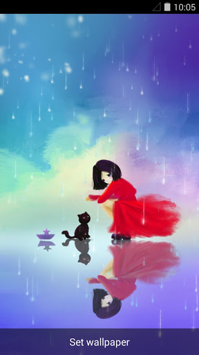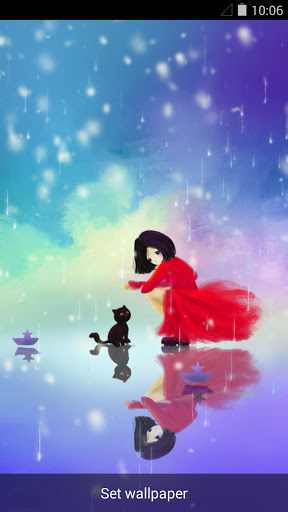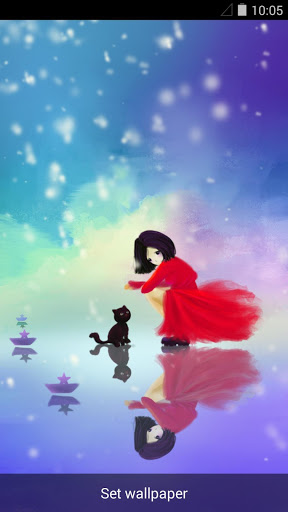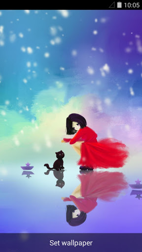 Be With You Live Wallpaper brings you into the lonely world of a lovely little girl in red dress. She is now standing on a frozen river alone with her black pet cat on such a cold winter day when big snowflakes are whirling in the sky.