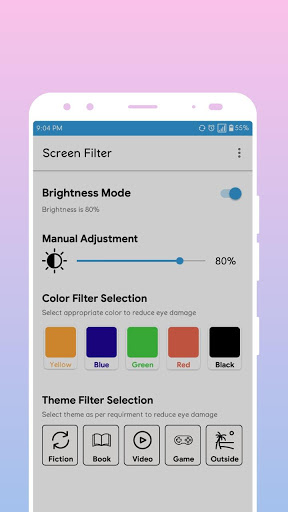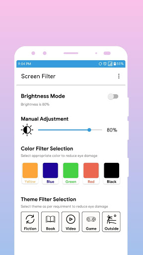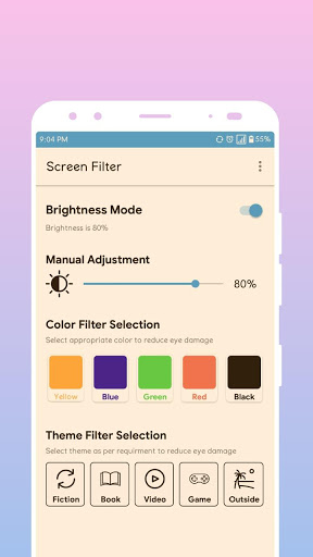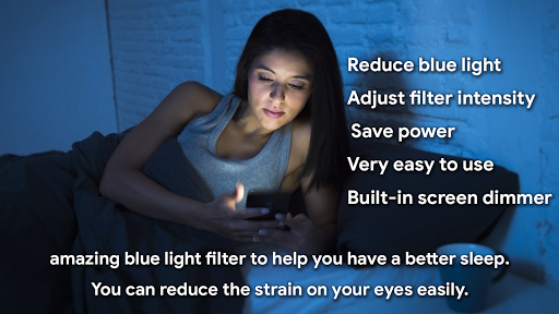 Best Screen filter has option to automatically adjust the backlight eye protector blue light filter.adjusts the brightness of your display based on our environment needs with screen filter and cooler control.It is a simple application that allows you to change the screen brightness, adjustable on screen control is top of all the windows on night mode black screen.eye protector from screen light app doesn't dim the screen but adjusts the screen color to reduce blue light which causes strain on your eyes.