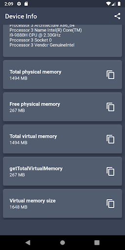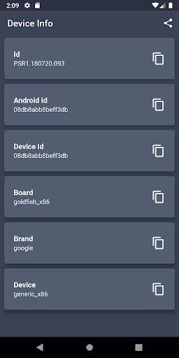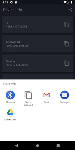 Id, Android Id, Device Id, IMEI, MEID, Board, Brand, Device, Hardware, Host, Manufacturer, Model, Product, Type, IsPhysicalDevice, Display, Fingerprint, Android Build Version Code Name, Android Build Version SDK, Android Build Version Security Patch, Android Build Version Release, Android Build Version Incremental, Kernel Architecture, Kernel Name, Kernel Version, System User Id, User Name, Number of Processors, Processors details, Total physical memory, Free physical memory, Total virtual memory, Virtual memory size