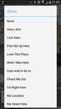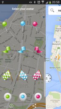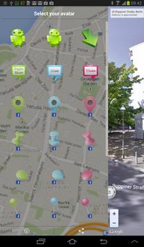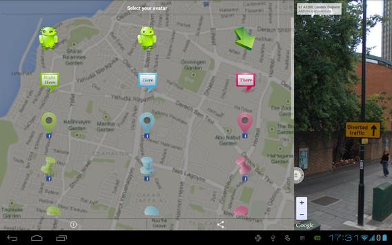 Mapify uses GPS to find your location, and if your location is supported by Google Street view then Mapify will automatically open in the street view, all you have to do is add an avatar in the exact place you are and press the capture button in order to share. The shared picture is also sent with a link to open a map of the selected location.