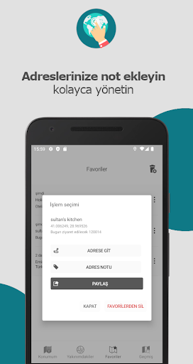Find out the coordinates of our topic and where you are on the basis of street, street, number, district and province. Share your current address with your relatives via any messaging application. If it is an address to be visited later, save the address or add a note to the address for easy remembering later.