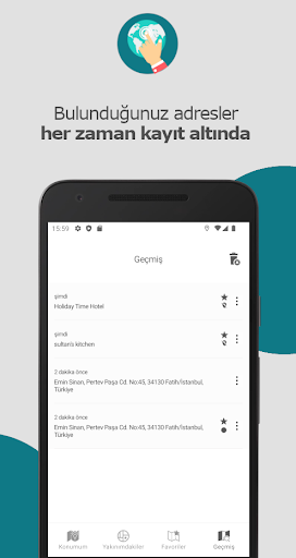 The addresses you are in are automatically recorded in your history list. These records are not deleted unless you want them to. You can delete collectively, daily or any address you want on an address basis. In your history list, you can see whether the GPS of the addresses is received, whether there is a location nearby or if it has been added to your favourite. As in all other lists, you can get directions to the address via the map application or navigation selected on your device in the history list.