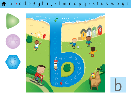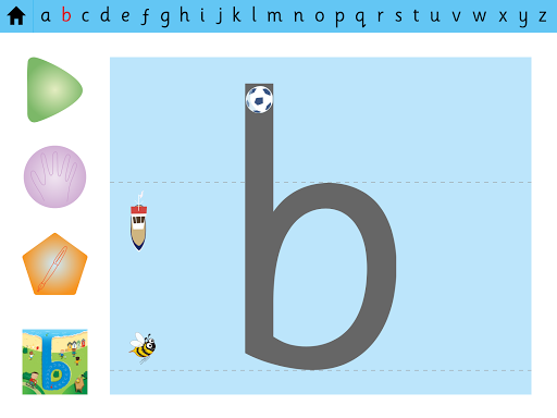 - Listen to the sound – play the song to introduce the letter sound and shape. Move the related character along the letter path to practise its formation.