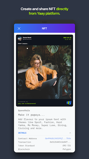NFT CREATION WITH YAAY NFT STUDIO: Yaay is the ONLY SOCIAL MEDIA PLATFORM IN THE WORLD where you can directly create NFT’s from your posts within the platform. Your NFT’s would have all your post details and they will be connected to your wallet. After minting, you can sell your NFT’s at various marketplaces.