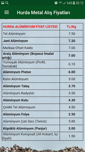 Bu mobil uygulama sayesinde metal borsası, hurda alüminyum, hurda bakır vb. hurda metaller ile ilgili günlük güncel hurda metal fiyatları, döviz kurları, LME ve emtia verileri, borsa verileri, anlık bildirimler alınabilir ve hurda piyasası takip edilebilir.