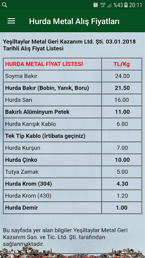 Yeşiltaylar Metal Geri Kazanım San. ve Tic. Ltd. Şt.i'nin Hurda Metaller, Güncel Günlük Hurda Metal Fiyatları, firma hakkında bilgilerin yanı sıra, iletişim bilgileri, sosyal medya sayfaları, hava durumu ve kullanımı kolay çeşitli araçların olduğu şirket mobil uygulamasıdır.