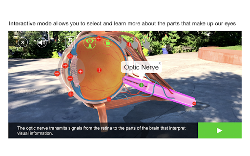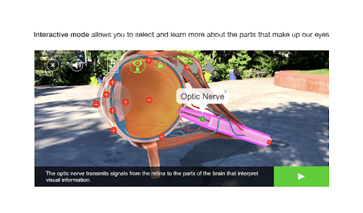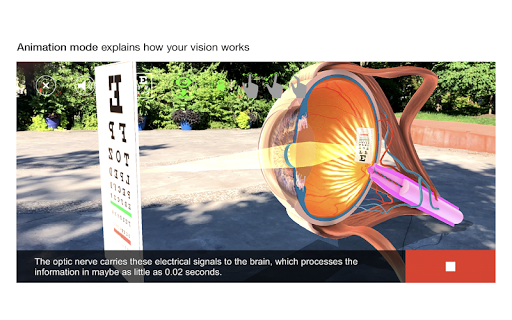 AR Eye has three modes: an animation mode that explains how our vision works, an interactive mode that allows you to select and learn more about the parts that make up our eyes and an impaired vision simulator which simulates what it would be like to have five different eye diseases.