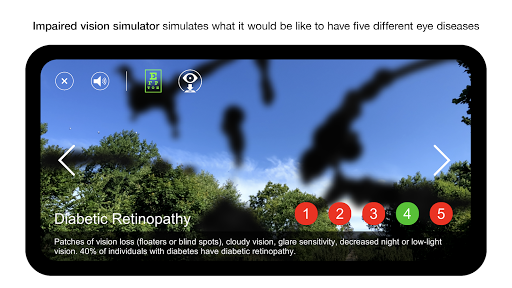 Download and launch the app, and aim the vision simulator at the image you want to see through the eyes of someone with vision challenges. Or, aim your device’s camera at any flat surface such as the floor or a table, and experience a virtual walk-through of a human eye.