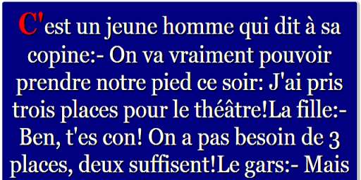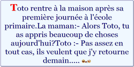 Chaque jour du mois une nouvelle blague pour vous donner au moins a vous et a vos amis un sourire et un rayon de soleil. La date courante est automatiquement mise à jour. Vous pouvez également utiliser ces blagues pour apprendre, tester et pratiquer la langue française. Découvrez des verbes conjugués, les noms, les pronoms, les adverbes, les adjectifs, les chiffres, et comment former et utiliser des phrases en francais.