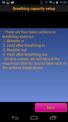 - This app allow user to configure breathing capacity. Once configured, all the exercises will be adjusted to user's capacity