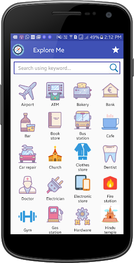 Explore Me helps you to discover great places of your interest like ATM, Bakery, Bank, Book store, Bus stop, Cafe, Garage, Church, Clothes store, Dentist, Doctor, Electrician,