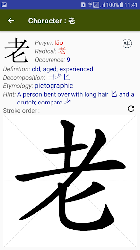 It include 5000 words from the official six HSK levels, more than 9000 Chinese characters with their definition, pinyin, pronunciation, stroke order and many more features.