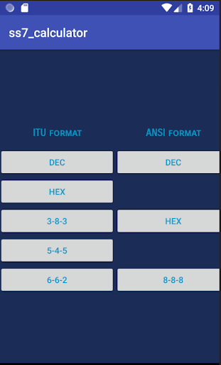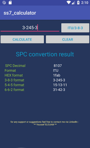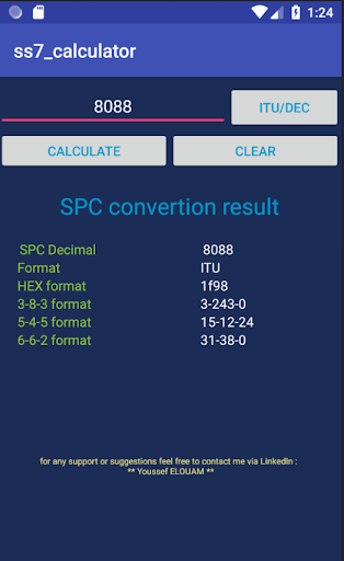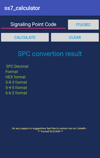 this application help telecom engineers convert SPC (SS7 Signaling Point Code) between Decimal, Hex and Dashed D-D-D notation. this app supports ITU (14 bits) and ANSI (24 bits) formats. if you are using another notation or other formats than ITU and ANSI please let me know, I will be happy to include it for you.