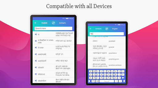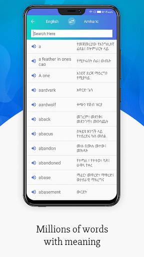 A lightweight android dictionary application works offline and gives faster results without any hassle. This free Amharic English Dictionary app is very helpful for pronunciation and spelling learning tool and it also has one powerful dictionary to translate sentences from Amharic to English and English to Amharic.