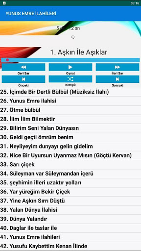 Bu uygulama çevrim dışı olarak da dinlenebilecek Yunus Emre ilahileri içermektedir.