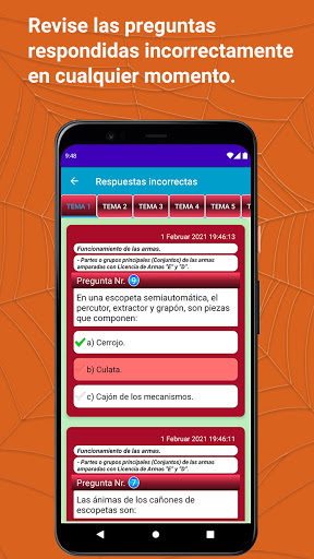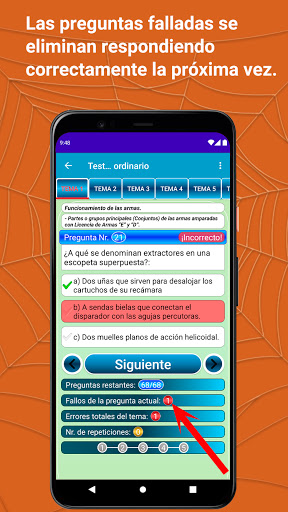 Al final de cada prueba, el usuario podrá ver un resumen de su prueba (respuestas correctas, respuestas incorrectas, estado del examen aprobado o suspendido) y haciendo clic en la prueba las respuestas correctas a las preguntas que han fallado.