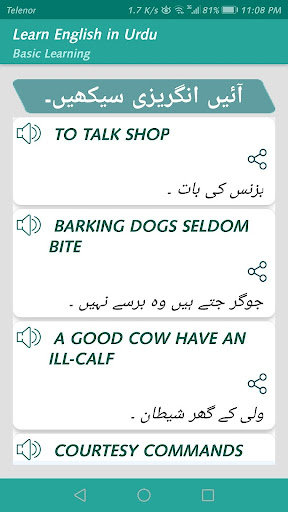 This app contains different segments so that one can understand and learn what to speak and more importantly where to speak. You can learn basic and to some extent advance English Speaking with our English language course in Urdu. In our app we have also included English Grammar, English Tenses lessons in Urdu and Urdu to English Dictionary, English Translator, Spelling Checker and English Pronunciation Expert with the help of those you can learn the basic concepts of English Language.