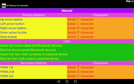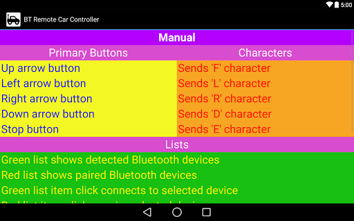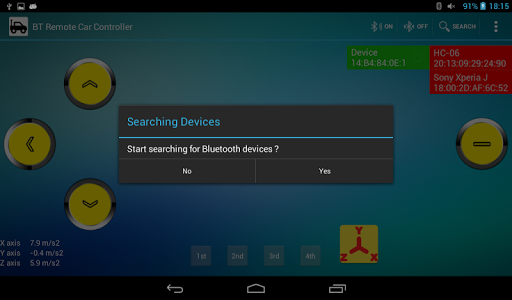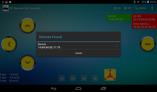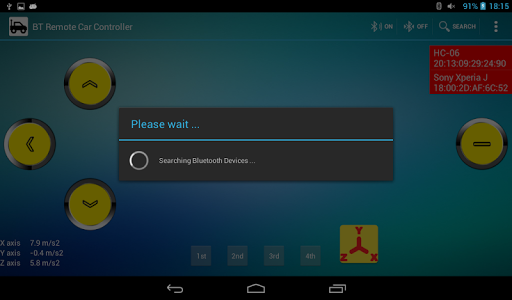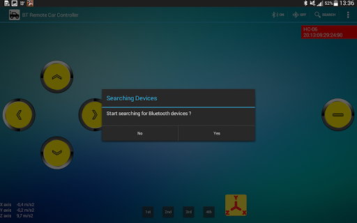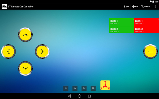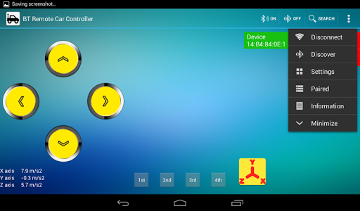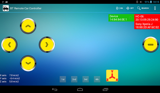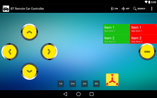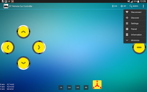 With this application we can handle any wireless Bluetooth remote-controlled vehicle that uses the Arduino platform or a similar one. We can perform basic steering functions like, left, right, front and back by using either the D-pad, yellow round buttons, or the accelerometer sensor of our device. There is a nice menu on top with some pretty good features.