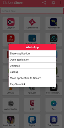 You can use this app to share apps (apk files) which are installed on your android device to another device via WhatsApp, Email, Bluetooth and via more mediums.