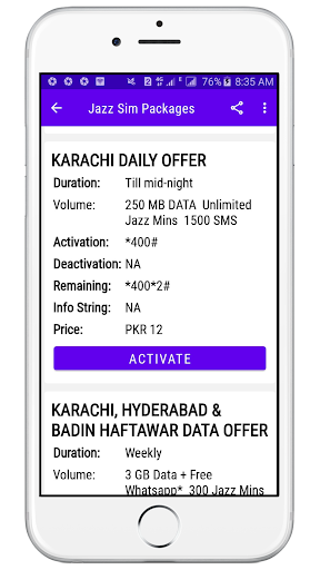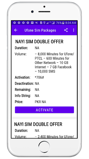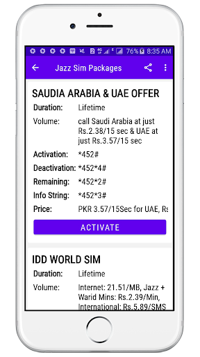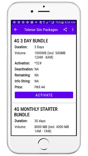 All packages information like SMS, Call, Internet 3G/4G detail is available along with prices. You can activate your favorite package just by single click. There is no need to remember what the package code is. This app provide information of all networks available in Pakistan like Jazz, Ufone, Telenor and Zong. The app also keep you updated about PTCL 3G/4G packages along with smart TV information.