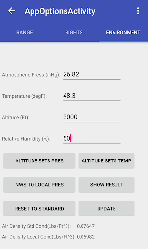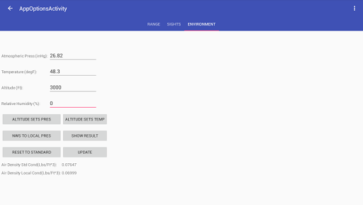 Local Altitude, Temperature, Pressure, and Humidity values may be used to provide a more precise shooting solution. Optionally, altitude may be used to correct Temperature and/or Pressure with the ICAO Standard Atmospheric Model.