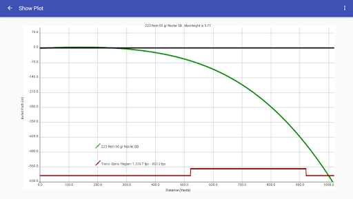 Exterior Ballistic tables and plots are computed for the current selected Cartridge to provide Velocity, Energy, and Bullet trajectory versus range distances.