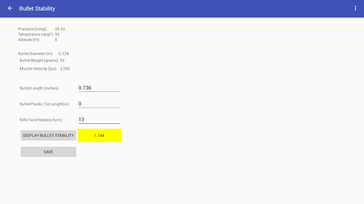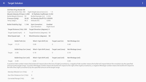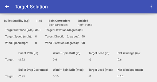 Bullet Length and Environmental factors are used to compute Bullet Stability for the firearms rifling twist rate. The Range and Target Solution pages allow the use of bullet stability information to compute spin drift.