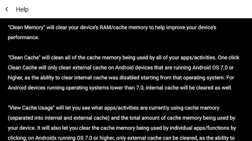**Note: We recommend pressing the "Clean Cache" button twice. Internal and external cache will be cleared on devices that run any operating systems lower than Android 8.0. Unfortunately Android 8.0 and up does not support the ability to clear internal cache for third party apps, so the button will only clear external cache on those devices. Essentially, you will not be able to delete internal cache through the app if you are running Android 8.0 or higher.