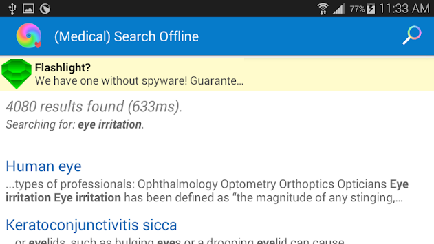 Whether you are in a bad connectivity spot in the city, in the country, in the forest or simply in Airplane Mode, Medical Wikipedia is there for you.