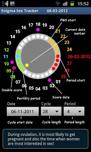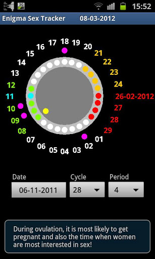 Enigma Sex Tracker works by PMS, menstruation and ovulation periods are followed month after month and You can simply log the times when you were most sexually active. The last ten sessions are saved to the next months so that you see when the best time in the next period occurs. By presenting all this information in a clear graphical interface that