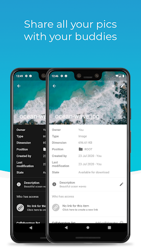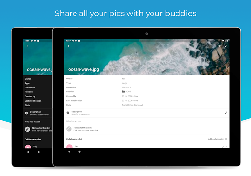 Access your camera and upload pics and videos straight into your Drive app, share any kind of files and manage the share with other users, defining access rights and visibility.