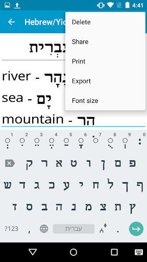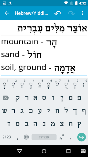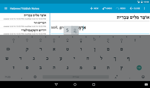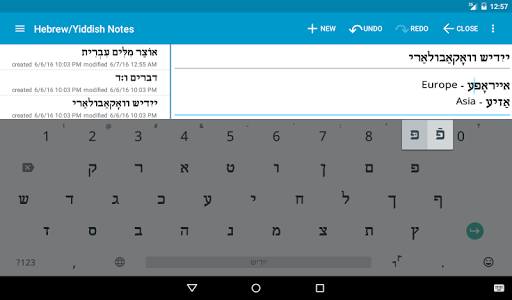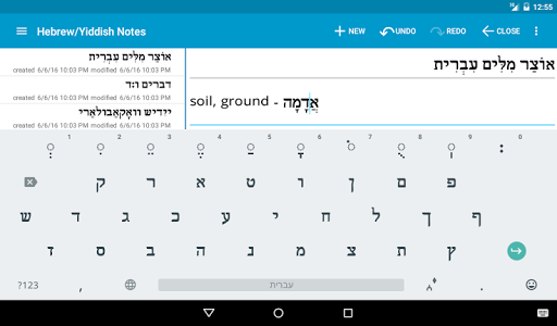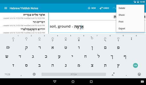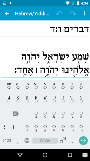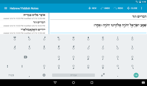 Hebrew/Yiddish Notes Keyboard is the best way to write Hebrew text with nikud (vowel points), trop (cantillation marks), and Yiddish characters on your Android device. It consists of a bi-directional notes app, plus a keyboard that can be used for text entry in any app. To switch to an English keyboard, long-press on the space bar to see a menu of available keyboards. Long-press on the space bar to switch back to the Hebrew or Yiddish keyboards.