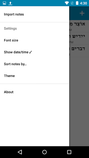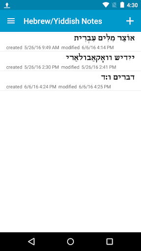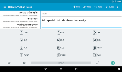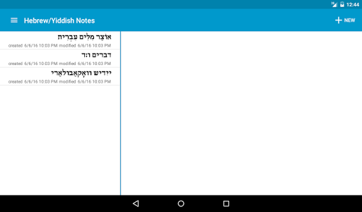 The notes app features the Traditional Hebrew/Yiddish OpenType Unicode font. This font, designed specifically for Android, accurately renders Biblical Hebrew, with proper placement of vowels (nikud, nekudot) and cantillation marks (trop, te'amim); it also supports medial meteg placement. This font supports Yiddish with all of the special Yiddish forms -- komets alef, pasekh alef, tsvey vovn, vov yod, khirik yod, tsvey yodn, pasekh tsvey yudn. The font can be continuously re-sized to suit your needs, both for viewing on your device and for printing. The notes app supports titles for notes, unlimited undo/redo, and printing through Google Cloud Print. Notes are automatically saved as you type. The notes app saves files as plain Unicode text. Files can be shared.