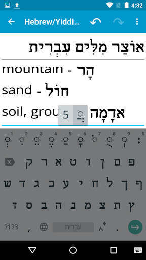 Hebrew: The Hebrew letters and vowels, with the vowels in an extra top row of the keyboard, plus a separate layout for the cantillation marks. A long press on most keys pops up a menu with additional forms. For example, a long press on the bet brings up the option for bet with dagesh, a long press on the vav brings up options for vav with dagesh (shuruq), holammale, and vav with holam haser,and a long press on the kamatz brings up options for the kamatz katan, hataf kamatz, and the number 6.