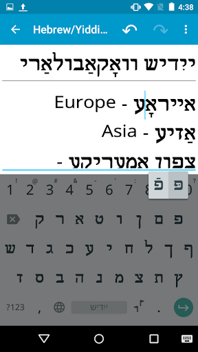 Yiddish: The Yiddish letters, with numbers in an extra top row of the keyboard. A long press on specific letter keys brings up options for additional Yiddish letters. Long press on bet, kaf, and pe for the dagesh or rafe forms of those letters. Long press on yod or vav for other forms of those letters. Long press on gimel, zayin, het, tsadi and tav for those letters pre-composed with geresh. Long press on the single quote for for geresh, long press on the double quote for gershayim. Long press on the numbers for commonly used symbols.