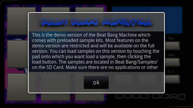 The Beat Bang Machine is drum machine (music production) app that comes with 8 built-in sound kits (72 samples). Most features are not available on the demo version. The full version is under development. Stay tuned for future updates.