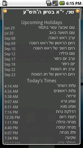 Hebrew Calendar with Parashat Hashavua, Jewish Holidays, Hannuka candles, Candle lighting times, Daf Yomi, Rosh Hodesh, Sfirat Omer and Prayer times (Zmanim).