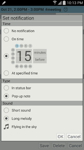 Rich notification/reminder options (any time, postponement, status bar or pop-up notifications, different sounds).