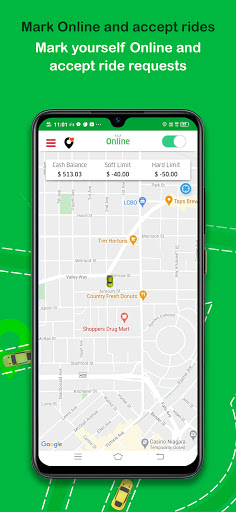 • Home: The 'Home' screen will show an 'online' button which will automatically switch on once you open the app. You will also find the 'cash balance', 'soft limit', and 'hard limit' at the top.
