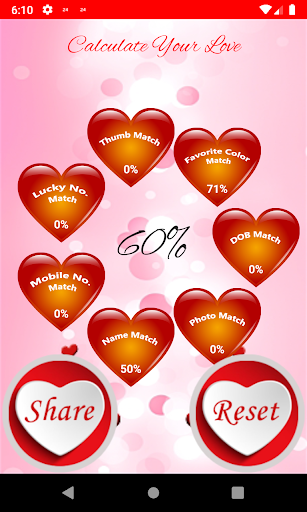Hold your breath !! There is one thing that you would absolutely love. If while calculating the love score, prima facie you get an unexpected score - in this case you can go into settings & preset the desired result. Now if you calculate & demo this to your lovely paramour , the score would come from the stored result which you already set :-)