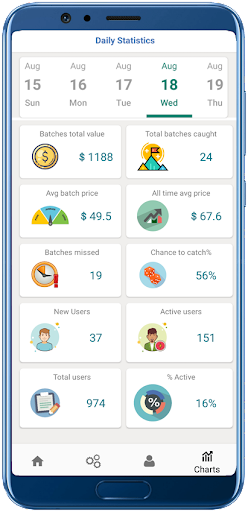 App automatically collects information and stores it locally(not in the cloud) which is visible only to you. It gives you better visibility on how many batches apps caught during the day or night.