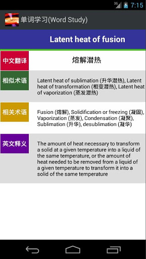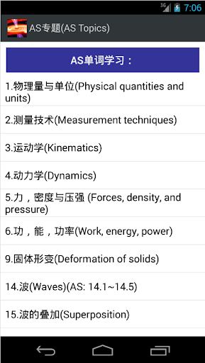 1) Word Study: for each of the important terms in English from both AS and A2, you can find its corresponding explanation in English, its translation in Chinese, the similar terms, and the related terms. The terms are groups according to the topics covered in the 2016 syllabus of CIE A-Level Physics.